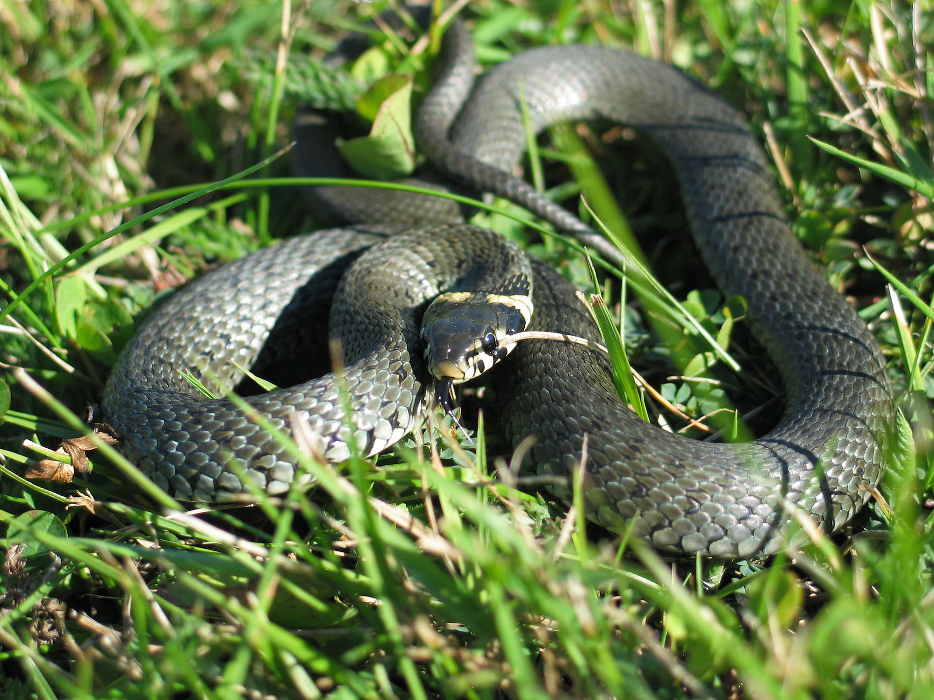 Molte bisce nostrane hanno un colore grigiastro o verdastro, talvolta con striature più chiare. Alcune, come la biscia dal collare, presentano un caratteristico “collarino” giallo/arancione dietro la testa. - Pupille e testa